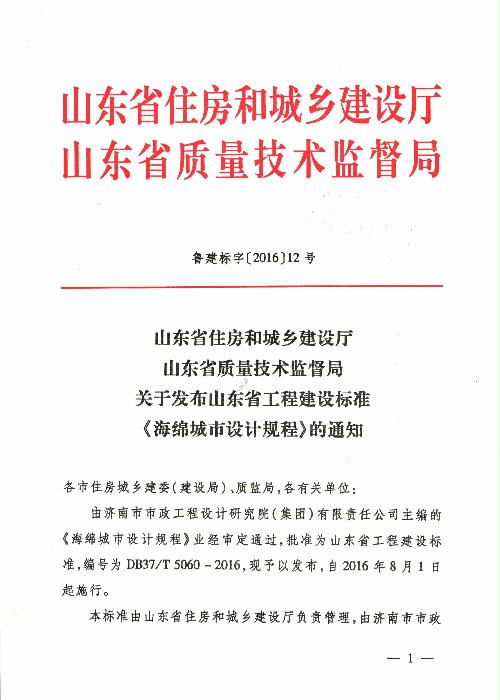關(guān)于發(fā)布山東省工程建設標準《海綿城市設計規(guī)程》的通知